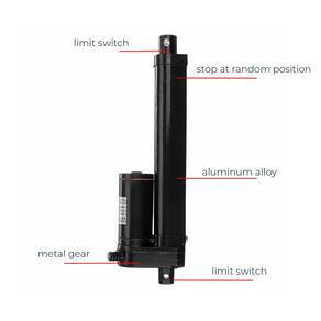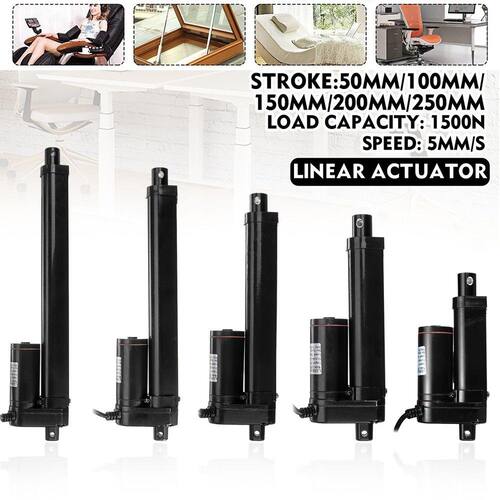 Material: Liga de alumínioCapacidade de carga: 1500NInput Tensão: 12V DCSpeed: 5mm/sStroke Comprimento: 50mm/100mm/150mm/200mm/250mmFreqüência de trabalho: 20%