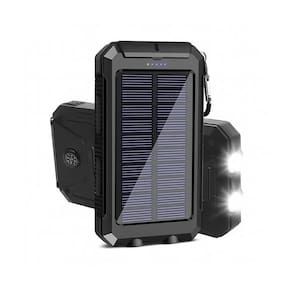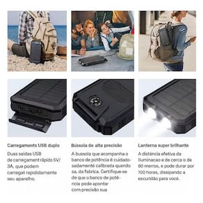 Power Bank Solar Portátil com chip integrado de reconhecimento inteligente de voltagem, bateria de alta capacidade e qualidade, painel solar integrado, lanterna LED dupla integrada com 3 modos de iluminação (contínuo, SOS e estroboscópico), carregamento rápido via USB, mosquetão para prender em bolsas ou equipamentos.Tipo