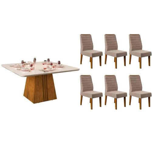 Sala de Jantar Completa It?lia c/ Tampo Madeirado c/ Vidro Curvo 136x136cm e 6 Cadeiras Ondina Freijo/Off White - Suede Kraft - DJ M?veis