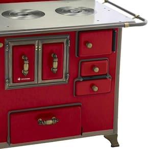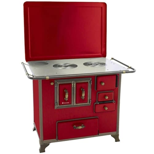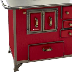 Chapa em ferro fundido com super polimento e maior dimensão; Pés em ferro fundido modelo rústico com acabamento em ouro envelhecido; Corpo e forno do fogão totalmente em aço carbono com acabamento esmaltado; Puxador e escoras do varão em Zamak com acabamento em ouro envelhecido; Varões em tubo de aço com acabamento em ouro envelhecido; Guarnições em ferro fundido com acabamento em ouro envelhecido; Modelo acompanha tampa; Forno com sistema de abertura de porta dupla; Modelo com conceito de antiguidade; Possui compartimento inferior para armazenagem da lenha, mantendo-a seca.Tipo