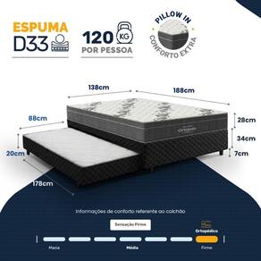 Espuma D33 (colchão principal), EPS (suporte), Malha (revestimento colchão), Espuma D28 (colchão auxiliar), Poliéster (revestimento base), Madeira tratada (estrutura base)Buscando um colchão com conforto e suporte equilibrados? Nosso colchão de espuma D33, com pillow in para uma camada extra de conforto, é ideal para quem precisa de suporte firme. Suporta até 120 kg por pessoa, proporcionando uma base estável para um sono reparador.