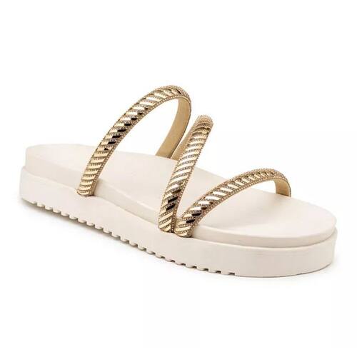` Sandália Papete Feminina Sola Preta Alta com Tiras de Strass Dourado Apresentamos a elegante Sandália Papete Feminina da TERRADOSCALCADOS, perfeita para quem busca conforto sem abrir mão do estilo. Esta sandália possui uma sofisticada sola preta alta, garantindo não apenas um visual moderno, mas também maior estabilidade e conforto ao caminhar. As tiras de strass dourado acrescentam um toque de brilho refinado, tornando este calçado ideal para ocasiões casuais e eventos sociais. Seja para um passeio à tarde ou uma noite especial, esta sandália é a escolha perfeita para complementar seu guarda-roupa. Principais Características:\nSola alta preta confortável Tiras de strass dourado Design elegante e sofisticado Material de alta qualidade para durabilidade\nEspecificações Técnicas:\nCor: Preto com detalhes em dourado Material: Sintético e strass Tamanhos disponíveis: 34 ao 40 Marca: flor da pele\nPor Que Escolher a Sandália Papete ? Além do design moderno e características premium, a Sandália Papete oferece uma experiência única de conforto, permitindo que você desfrute do dia a dia com estilo. `