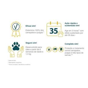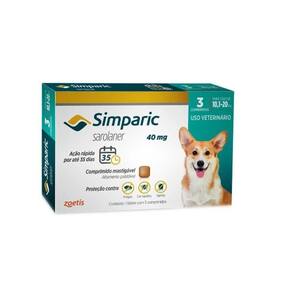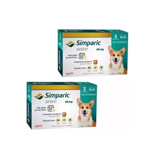 2 Antipulgas e Carrapatos Simparic 40mg Cães 10,1 A 20kg C/3 Comprimidos O antipulgas zoetis simparic 40 mg para Cães 10 a 20 kg utilizado para o tratamento das infestações por pulgas e sarna sarcótica. Após a administração do Simparic, a sua atividade contra pulgas dura, pelo menos, 5 semanas. O também pode ser utilizado como parte de uma estratégia de tratamento para o controle da dermatite alérgica por picada de pulga uma reação alérgica às picadas de pulga . Contém a substância ativa sarolaner. - Mata as pulgas antes que produzam ovos - Controle de dermatite alérgica por picada de pulga DAPP ; - Possui ação rápida: fazendo efeito em 3 horas, mantendo-se por até 35 dias; - Combate também três tipos de sarnas: Sarcópticas, Demodécica e Otodécica; - Indicada para cães a partir de 8 semanas de idade e com acima de 1,3 Kg; - Pode ser utilizado em cachorros de portes e raças diferentes; - Sim, Simparic extermina carrapatos e pulgas instantaneamente e age alem do período de tratamento mensal -simparic é eficaz contra 11 espécies de carrapatos Marca: Não Informado