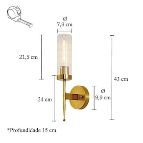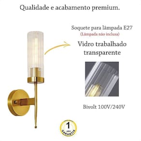Estilo moderno formado tocheira, o lup56 é a arandela que combina com qualquer ambiente interno. A sua cúpula com detalhes trabalhados em conjunto com sua estrutura em dourado fornece uma beleza sutil e elegante. Neste kit contém:- 02 unidades da arandela -Descrição da arandela:- Materiais: Vidro e Metal Estrutura: Metal Cúpula: Vidro- Cor: Estrutura: Dourado Cúpula: Transparente- Medidas: Estrutura: 24 cm Profundidade: 15 cm Altura total: 43 cm Base ou canopla que fixa na parede : 9,9 cm Cúpula : 7,9 cm- Voltagem: 100-240V- Soquete: E27 Lâmpada não inclusa