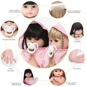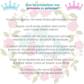 A nossa empresa tem a missão de garantir a total satisfação de seus clientes, onde a qualidade e o atendimento excepcional são nossa prioridade Estamos muito felizes em apresentar as Boneca Bebê Reborn Gêmeas para você, um produto cuidadosamente selecionado para atender às suas necessidades. Compre agora e experimente a diferença em comprar com a nossa loja.As Bonecas Bebê Reborn Gêmeas são o sonho das meninas Produzida 100% em vinil siliconado, essas bonecas podem sentar, deitar e fazer tudo que a sua imaginação deixar. Com seus olhos castanhos e detalhes realistas elas são encantadoras e apaixonantes. Sua criança merece a melhor qualidade de bebê reborn Marca: Cegonha Reborn DollsModelo: Boneca Bebê Reborn GêmeasCor: BegeMaterial: Vinil Siliconado AtóxicoCaracterísticas Principais: Membros Articulados, Corpo de Silicone, Detalhes Realistas.Medidas Aprox.: Altura da Boneca: 46cm Peso Aprox. Da Boneca: 0,745 Kg Certificado INMETRO Recomendado para crianças maiores de 03 anosConteúdo:2 Bebê Reborn Cabeça, Membros e Corpo de Vinil 2 Saída de Banho2 Par de Cílios2 Par de Brinco2 Chupeta 2 Mamadeira Simples10 Certificados6 Fraldas2 Laço Cetim4 Presilhinha2 Par de Luvas2 Bolsa Maternidade2 Prendedor de Chupeta2 Kit Pente e Escova SimplesGarantia30 dias de garantia oferecida pelo fabricante.Dúvidas Frequentes:1. Elas acompanham ItensR. Sim, todos os itens da descrição.2. Elas emitem algum somR. Não, elas não emitem nenhum som.3. Pode dar banho na bonecaR. Sim, pois o material do corpo é de Silicone.4. Pode escolher a cor dos olhos da bonecaR. Não, os olhos já vêm de fábrica.Tags: Realista, Menina, Infantil, Silicone, Princesa, Linda, Morena, Loira, Fofa, Banho, Enxoval, Completo, Grande, Baby Alive.Homologação Inmetro: IP-BRI-0406/2022-07