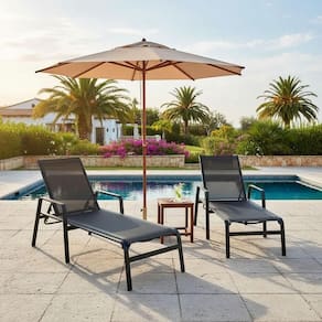 Alumínio, Tela Sling, Tecido Bagum, Madeira, ConcretoAproveite momentos de lazer com conforto e praticidade com o Kit 2 Espreguiçadeiras Sevilha Tela Sling em Alumínio + Guarda-Sol com Base.