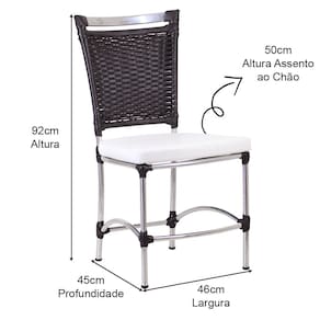 Especificações Técnicas: Altura total: 94 cm Altura assento ao chão: 50cm Largura: 48cm Comprimento: 44cm Suporta até 170 kg
