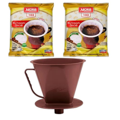 Kit 2 coador filtro moka permanente 103 + porta filtro com funil leve mais praticidade, economia e sustentabilidade para a sua cozinha com o kit coador moka 103 ideal para preparar aquele café fresquinho a qualquer hora do dia, esse kit vem com filtros permanentes e um porta filtro com funil acoplado, facilitando o uso e garantindo o encaixe perfeito na sua garrafa. Destaques do kit: - filtros reutilizáveis em feltro sintético tnt - mais economia e menos resíduos. - funil integrado ao suporte - praticidade no encaixe e no uso. - design compacto e funcional - fácil de guardar e usar em qualquer ambiente. - limpeza simples - basta descartar o pó e enxaguar o filtro. Modo de uso: Posicione o filtro moka no porta filtro. Adicione o café de sua preferência e despeje a água quente. Após o uso, descarte o pó e lave o filtro com água corrente. Pronto seu filtro está limpo e pronto para o próximo café. Especificações do produto: Filtro moka permanente 103: - diâmetro: 13,8 cm - profundidade: 15 cm - material: feltro sintético de polipropileno tnt Porta filtro com funil 103: - altura: 13 cm - diâmetro da boca: 13,5 cm - diâmetro da base: 12 cm - material: plástico resistente conteúdo da embalagem: - 2 filtros moka permanente 103 - 1 porta filtro com funil acoplado 103 Marca: Não Informado