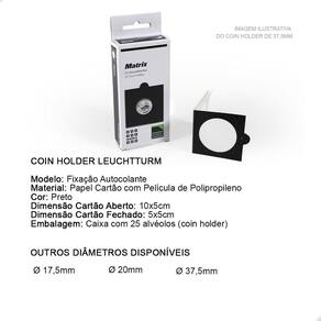 O Coins Holder Autocolante é uma importante ferramenta para armazenar e proteger suas Moedas.Os porta-moedas Coins Holder Leuchtturm protegem perfeitamente suas moedas de quaisquer influências do ambiente externo, graças à película utilizada que não contém amaciadores químicos.O Coins Holder tem como função proteger sua moeda:- evita o contato com o ambiente externo- evita o manuseio incorreto da peça (sem luvas ou com a mão suja)- facilita a exposição de sua peça na sua coleção- facilita a logística de sua peça, permitindo que você leve em eventos ou para negociar com mais praticidade e proteção- excelente organizador, pois centraliza a moeda no bolso da folha, deixando sua exibição muito mais bonita, organizada e apresentávelO Coins Holder Leuchtturm é produto de fabricação na Alemanha, e é conhecido por sua qualidade no material e em proteger as moedas. Diferente de qualquer outro Coins Holder, o Leuchtturm possui uma "pequena aba" utilizada para "empurrar" o Coins Holder, facilitando seu manuseio. Para isso, utilize as folhas adequadas para estes Coins Holders.No critério de organização, o Coins Holder se destaca ao promover a padronização da exposição de suas moedas. Tenha uma apresentação muito mais bonita e profissional utilizando Coins Holders.CARACTERÍSTICAS:Modelo: Fixação AutocolanteMaterial: Papel Cartão Preto com Película de PolipropilenoDimensão Cartão Aberto: 10x5cmDimensão Cartão Fechado: 5x5cmDiâmetro deste Anúncio: Ø 20mmEmbalagem: Caixa com 25 alvéolos (coins holder) cada caixaSUGESTÃO DE ARMAZENAMENTO DO COINS HOLDER COM A MOEDAO Coins Holder pode ser armazenado em folhas próprias para coleções de Moedas respeitando o espaço mínimo de 5x5cm cada bolso onde o holder será colocado, caixas organizadoras e separadoras, estojos (cartelas dobráveis) próprios para Coins Holders.COMO UTILIZAR:1- Para utilizá-lo você deve primeiramente dobrar ao meio, na marcação indicada, para facilitar o fechamento com a moeda.2- Em seguida, você deverá posicionar a moeda no centro do Coins Holder, em cima da película de plástico, onde a moeda será exibida. Certifique-se de que sua moeda está perfeitamente alinhada com alguma das laterais do Coins Holder pois após fecha-lo, não conseguirá mais mover a moeda.3- Dobre o coin holder ao meio, por cima da moeda, envolvendo-a completamente até colar. Marca: Leuchtturm