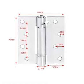 Dobradiça com mola inox 4 x 3.5 x 2,5mm Dobradiça com mola para fechamento automático suave das portas. Utilizada no lugar das molas aéreas funciona perfeitamente em portas pesadas e leves. Com uma mola interna de fácil regulagem da força de fechamento é super fácil de instalar, discreta mantendo a estética da porta e economiza espaço que uma mola aérea convencional ocupa. Características: - dobradiça de inox com mola integrada - capacidade de carga até 50kg/cada 2 peças - fchamento automático com regulagem da mola - espessura de 2,5mm - altura da dobradiça: 99mm - largura: 88mm - espessura mínima da porta: 35mm Observação Acompanha haste para regulagem da força da mola e caso optem por regular pela cabeça do produto utilizar uma chave allen 5mm a chave allen não acompanha o produto Dica Em portas de 2,10 de altura, mesmo pesando menor do que 50 kg o ideal é ser colocado 3 dobradiças para um bom funcionamento da mola Instruções para instalação e regulagem 1 encaixe a chave allen na cavidade sextavada 2 retire o pino de ajuste girando e pressionando a chave contra a dobradiça 3 fixe a dobradiça de maneira convencional, depois de retirar o pino de ajuste 4 com a porta fechada, encaixe novamente a chave allen na cavidade sextavada 5 gire-a em sentido anti-horário, pressionando-a contra a dobradiça 6 recoloque o pino de ajuste no orifício mais à esquerda 7 cada orifício corresponde a uma pressão para fechar a porta. Quanto mais girar a chave a direita e colocar o pino a esquerda, maior será a pressão. ajuste da maneira necessária a sua necessidade Marca: Não Informado