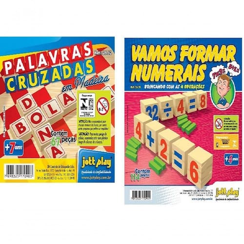 2 Em 1 - Vamos Formar Numerais + Palavras Cruzadas -181 Peças Palavras Cruzadas 67 Peças Cx. MadeiraDesenvolve: Agilidade motora, comunicação, habilidade escrita, nível de vocabulário, linguagem verbal, separação de sílabas, classificação (vogais e consoantes, maiúsculas e minúsculas). Composição: contendo 67 pedras de MDF. Alfabeto impresso nas letras de imprensa. Caixa em madeira medindo: 05x25x25cm.--------------------------------------------------------------------- Vamos Formar Numerais ( 114 pçs)Desenvolve: perações aritméticas, raciocínio lógico matemático (jogo). Inclui uma sugestão de jogos utilizando as peças com os numerais e uma matriz impressa na tampa.Composição: Caixa de madeira tipo estojo medindo 04x24x24cm. Com tampa de correr, contendo 114 pedras. Acompanha instrução. Palavras Cruzadas 67 Peças Cx. MadeiraDesenvolve: Agilidade motora, comunicação, habilidade escrita, nível de vocabulário, linguagem verbal, separação de sílabas, classificação (vogais e consoantes, maiúsculas e minúsculas). Composição: contendo 67 pedras de MDF. Alfabeto impresso nas letras de imprensa. Caixa em madeira medindo: 05x25x25cm.--------------------------------------------------------------------- Vamos Formar Numerais ( 114 pçs)Desenvolve: perações aritméticas, raciocínio lógico matemático (jogo). Inclui uma sugestão de jogos utilizando as peças com os numerais e uma matriz impressa na tampa.Composição: Caixa de madeira tipo estojo medindo 04x24x24cm. Com tampa de correr, contendo 114 pedras. Acompanha instrução.