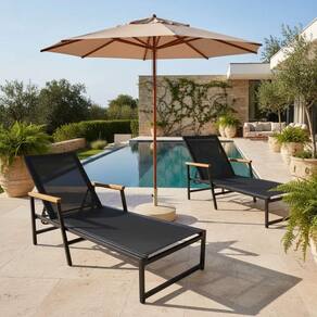 Transforme sua área externa em um espaço sofisticado e confortável com o Jogo 2 Espreguiçadeiras Amélia em Alumínio com Tela Sling e Braços em Madeira + Guarda-Sol de 3,00m com Base de Concreto.