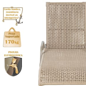 Produto conhecido como: Espreguiçadeira reclinável, Espreguiçadeira em alumínio, Espreguiçadeira com encosto ajustável, Espreguiçadeira para área externa, Espreguiçadeira para piscina, Espreguiçadeira resistente ao tempo, Espreguiçadeira moderna, Espreguiçadeira confortável, Móveis para área externa, Móveis de alumínio para jardim, Corda náutica para móveis, Espreguiçadeira leve e durável, Design sofisticado para áreas externas, Decoração para varanda e piscina, Espreguiçadeira resistente ao sol e chuva.