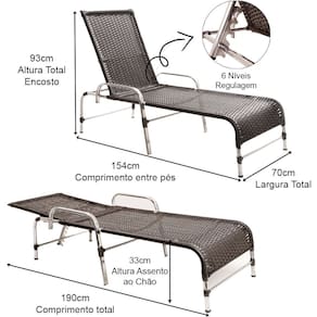 ESPECIFICAÇÕES TÉCNICAS: Espreguiçadeira Catar: - Altura total: 36 cm - Assento ao chão: 33cm - Largura: 70 cm - Comprimento: 195 cm - Pé ao pé: 155cm - Suporta até 170 kg - Possuem 06 tipos de regulagens