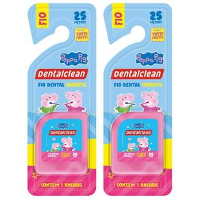 2 fio dental infantil - peppa pig - 25m - rosa - dentalclean 2 x fio dental infantil - peppa pig - tutti frutti - 25m - rosa - dentalclean O fio dental infantil peppa pig possui 25 metros e sabor tutti frutti, ideal para incentivar o hábito de usar fio dental desde pequeno. Este item foi desenvolvido para ajudar os pais a completarem a higienização bucal das crianças. O fio dental infantil deve ser utilizado preferencialmente antes da escovação, depois de cada refeição. No mínimo, é recomendado passar o item uma vez ao dia entre os dentes, na escovação noturna. Entre os dois e seis anos de idade, os dentes começam a se encaixar um do lado do outro o que aumenta as chances de restos de alimentos ficarem presos nos dentes. À medida que as crianças vão desenvolvendo suas habilidades, é indicado dar sequência ao hábito de modo independente. Geralmente, as crianças conseguem dominar o uso do fio dental por conta própria por volta dos oito anos de idade.
