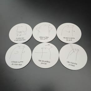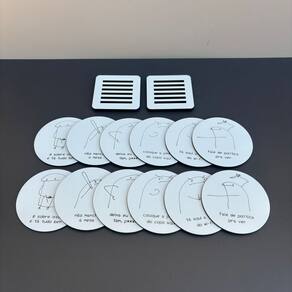 Conjunto Duplo de Porta Copos - Frases Engraçadas do Meme Flork Este conjunto duplo de porta copos é a escolha perfeita para quem procura itens funcionais e divertidos para proteger móveis de manchas e arranhões. Cada kit inclui 6 porta copos feitos em MDF de alta qualidade, com 8,5 cm de diâmetro e 2,5 mm de espessura, apresentando frases engraçadas do meme Flork gravadas a laser. Além disso, cada conjunto vem acompanhado de um suporte para armazenamento, garantindo uma organização prática e fácil. Leves e fáceis de limpar, esses porta copos são ideais para uso diário em casa ou no escritório. O humor é garantido com as frases bem-humoradas, tornando este conjunto de porta copos um presente único e exclusivo para amigos e familiares. Eles são perfeitos para quem adora memes e quer dar um toque de diversão e originalidade à sua decoração. Cada kit contém: 6 descansos de copo 1 base Material: MDF Medidas: Porta copo: 8,5 x 8,5 cm Base: 7,5 x 7,5 cm Frases: É sobre isso e está tudo bem Deixa eu falar tbm, p**** Tá aqui a senha do wi-fi Coloque a p**** do copo aqui Fale de política pra ver Não manche a mesa Kit com um de cada Especificações do Conjunto Duplo: 2 kits de 6 porta copos cada 2 suportes para armazenamento Dobre a diversão e a proteção com este conjunto duplo de porta copos! Ideal para presentear e para quem precisa de um estoque extra para todas as ocasiões.