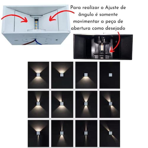 2 Luminárias Arandelas Quadradas 4W Pretas Branco Quente De Parede Com Facho De Luz Ajustável Regulável Direcionável O Balizador Arandela Led, Branco Quente é indicado para decorar e iluminar áreas residenciais e comerciais como: garagens, quintais, corredores, jardins, escritórios, janelas, paredes, banheiros, restaurantes, toaletes, lanchonetes, muros, bares, salas de estar e jantar, escadas e onde for apropriado, oferecendo, destaque, beleza e elegância ao ambiente.Especificação do produto:- Material: Plástico ABS- Cor do Produto: Preto- Potência da iluminação: 4 Watts- Tensão: 100-265V/50-60HZ- Corrente: 0.110.055A- Fonte de energia: Elétrica - Bivolt 110/220v - IRC=80 FP=0.5- Direção da luz: Para cima e para baixo com regulagem- Proteção em Nível: IP65- Temperatura da Cor: 3000K-3500K - Branco Quente- Quantidade de led: 6 Leds- Vida Útil: Até 25.000h- Ângulo de Abertura da luz: 45º Graus- Aplicação: Uso Interno e Externo- Peso Total do Produto: 500 gramas Medidas do Produto: - Medidas da luminária: Comprimento: 11,7cm x Largura: 11,7cm x Profundidade: 5,1cm Precauções:- Procure um profissional especializado para a instalação.- Desligue a rede elétrica antes da instalação ou substituição deste produto. Itens inclusos:- 2 Arandelas- 2 Kits instalações contendo parafusos e buchas