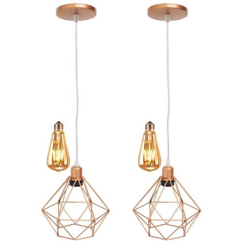 2 Pendentes Aramado Diamante Lustre Cabo Cristal P + 2 Lâmpadas Led ST64 Vintage Retrô Agp Gmh - Cor: Cobre Rose Gold