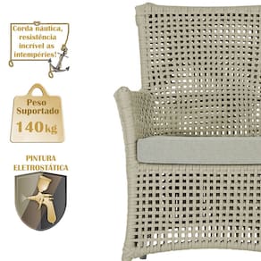 A corda náutica adiciona um toque de rusticidade moderna, enquanto o estofado impermeável garante que sua poltrona esteja sempre impecável, mesmo após uma chuva inesperada ou um acidente com líquidos.