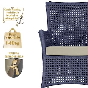 A corda nautica adiciona um toque de rusticidade moderna, enquanto o estofado impermeavel garante que sua poltrona esteja sempre impecavel, mesmo apos uma chuva inesperada ou um acidente com liquidos.