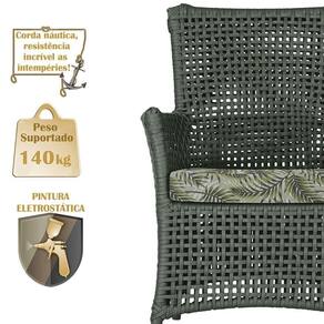 A corda nautica adiciona um toque de rusticidade moderna, enquanto o estofado impermeavel garante que sua poltrona esteja sempre impecavel, mesmo apos uma chuva inesperada ou um acidente com liquidos.