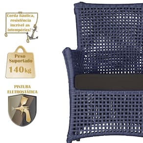 A corda nautica adiciona um toque de rusticidade moderna, enquanto o estofado impermeavel garante que sua poltrona esteja sempre impecavel, mesmo apos uma chuva inesperada ou um acidente com liquidos.