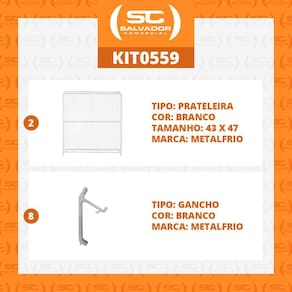 Componentes do kit: - 2 prateleiras branca visa vn25/28 vb25/28 vf28 - metalfrio - 8 ganchos - metalfrio
