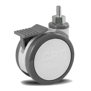 Rodizio hospitalar roda dupla, em PU na cor branca com cinza, com duplo rolamento de esferas de precisão e calotas de proteção, e com espiga de rosca parafuso M12 x 1" Passo da rosca 1.75mm