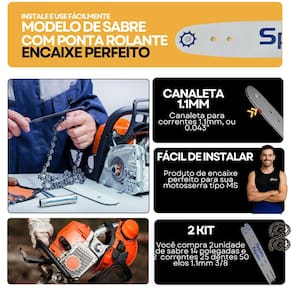 Comprimento: 14 35 cm Passo da corrente: 3/8 Espessura do canal: 1.1 mm 0.043 Dentes: 25 Material: Aço de alta resistência com tratamento anticorrosivo Encaixe: Compatível com Stihl MS 170, MS 180 Tipo de ponta: Rolante menor atrito, maior vida útil
