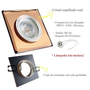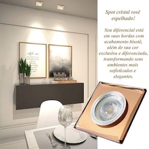 O spot cristal espelhado rosê traz para seu ambiente um ar de delicadeza e glamour através de sua cor exclusiva e diferenciada. As suas bordas possuem acabamento bisotê, dando um toque de leveza, além de criar uma moldura delicada no spot. É um produto para quem deseja uma iluminação sem abrir mão de uma decoração moderna e sofisticada. Fácil de instalar e ótimo para qualquer ambiente.Neste kit contém:- 02 unidades do spot -Descrição do spot:- Material: Cristal espelhado rosê e alumínio Dimensões: Comprimento: 9 cm Largura: 9 cm Altura: 0,8 cm Recorte no teto : 7 cm- Soquete: GU10 incluso - Modelo da lâmpada: MR16 - LED - Dicroica- Quantidade de lâmpadas: 01- Potência máxima: 50W Lâmpada não inclusa.