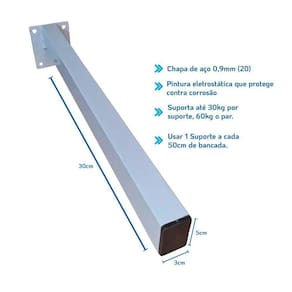 Especificações Técnicas Cor: Branca Pintura Eletrostática Resistencia: até 80 kg por par de suporte Dimensão: 5cm altura x 3cm de largura x 30cm de profundidade Espessura do Metalon: 0.9mm 20 super resistente Espessura da Base: 3mm Acabamento: Plástico