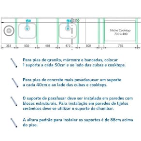 Instalação do Suporte de Parafusar O suporte de parafusar deve ser instalado em paredes com blocos estruturais. Para instalação em paredes de tijolos cerâmicos deve se utilizar o suporte de chumbar. Para pias de granito, mármore e bancadas, colocar 2 suportes a cada metro de bancada, 1 suporte a cada 50cm. Para pias de concreto que são mais pesadas, usar um suporte a cada 40 cm para sustentação do peso. Usar parafusos sextavados 1/4x50 com bucha 10. Para ter tamanhos menores, você pode cortar a ponta do suporte, sem afetar sua estrutura. A altura padrão do chão para instalar os suportes é de 88cm.