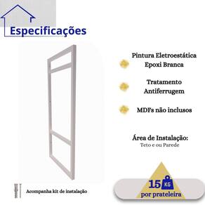 Especificações Técnicas Suporte Tubo Metalon Quadrado: 15x15 Profundidade para Madeira: 25cm Resistencia: até 15 kg por nivel de prateleira Distância entre prateleiras: 1º Nivel ao 2º Nivel: 13,5cm 2º Nivel ao 3º Nivel: 32,5cm Area de Instalação: Parede e ou Teto
