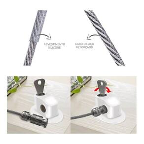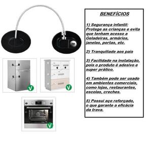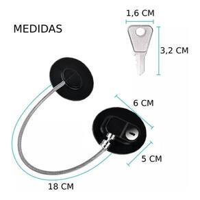 Tipo: Trava fechamento de segurança com cabo em aço Material Fechadura: ABS Cor do acabamento: Branco ou preto opcional Material do cabo: Aço duplo torcido medindo 18 cm possui revestimento para proteção dos móveis Material Fixação: Fita adesiva dupla face de alta resistência Peso: 50 gr Tamanho Trava: 6 x 5 cm Tamanho Cabo: 18 cm ver foto Cada pacote contém: 1 fechadura + chave