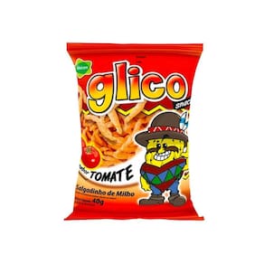 Salgadinho de milho Glico nos sabores Tomate, Frango e Queijo. Contém aromatizante sontético indêntico ao natural. Peso líquido 40 gramas.