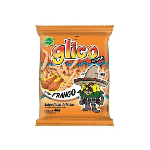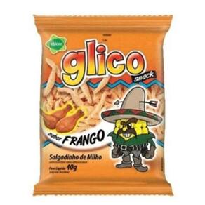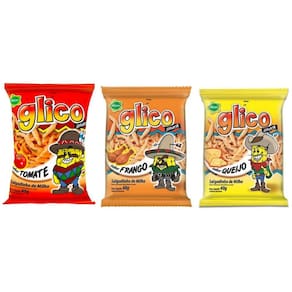 Salgadinho de milho Glico nos sabores Tomate, Frango e Queijo. Contém aromatizante sontético indêntico ao natural. Peso líquido 40 gramas.