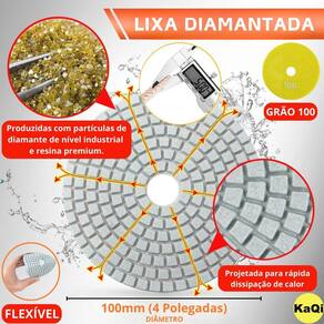 Transforme o acabamento das suas superfícies com o Kit Lixas Diamantada 4 Polegadas 100mm da KaQi Desenvolvido para oferecer o melhor polimento e acabamento, é perfeito para quem busca resultados profissionais, tanto em pedras como granitos, mármores, cerâmicas, quanto ardósia, calcário, dekton, quartzo, porcelanato, pedra projetada, concreto, nanoglass, super nano, vidro e muito mais. Seu lixamento pode ser a seco e a úmido, o que proporciona um processo mais rápido, sem gerar calor excessivo. Assim, é possível garantir um resultado sem manchas ou falhas, e ainda favorece um efeito brilho d'água incrível
