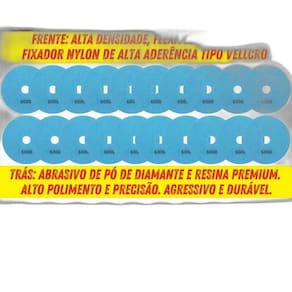 Modo de uso: aceita lixamento tanto, a úmido, quanto, a seco. No úmido utiliza-se com uma politriz úmido de qualquer marca que aceite um prato com rosca M14 ou máquina polidora utilizada em indústrias de mármore e granito para polimento nas bordas da pedra. Quando o uso é a seco, aceita lixadeiras, esmerilhadeiras e politrizes. Em ambos os casos, basta encostar o costado de tecido adesivo ao disco prato suporte com que também tenha vellcro, e então fazer o devido uso.