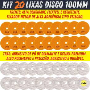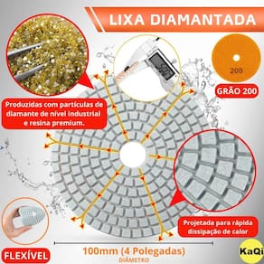 20 X Lixas Discos Grão Liso 4 Pol.100mm Diamantada Granito Mármore KaQi GRÃO: 200 Kit 20 Lixas Diamantada Grão Disco Liso 4 Polegadas 100mm KaQi Para Desbaste, Polimento, Acabamentos. Lixamentos Seco e Úmido. Ideal para profissionais e entusiastas de reformas e construção. Alta qualidade, resistência e desempenho superior. Transforme o acabamento das suas superfícies com o Kit Lixas Diamantada 4 Polegadas 100mm da KaQi Desenvolvido para oferecer o melhor polimento e acabamento, é perfeito para quem busca resultados profissionais, tanto em pedras como granitos, mármores, cerâmicas, quanto ardósia, calcário, dekton, quartzo, porcelanato, pedra projetada, concreto, nanoglass, super nano, vidro e muito mais. Seu lixamento pode ser a seco e a úmido, o que proporciona um processo mais rápido, sem gerar calor excessivo. Assim, é possível garantir um resultado sem manchas ou falhas, e ainda favorece um efeito brilho d'água incrível Principais características: 1. Durabilidade Extra, alta resistência ao desgaste, longa vida útil e desempenho, além de excelente performance em diversos tipos de materiais. 2. Acabamento Impecável no desbaste e polimento de superfícies de pedra, mármore, calcário, ardósia, porcelanato e outros, sem deixar manchas ou marcas indesejadas. Pode ser trabalhada em superfícies claras ou escuras. Oferece uma remoção eficiente de material e um acabamento uniforme. 3. Versatilidade no uso com diversas ferramentas, já que pode ser Utilizado em esmerilhadeiras, lixadeiras, politrizes e furadeiras elétricas. 4. Eficiência de Montagem, uma vez que possui sistema de fixação tipo vellcro, basta encostar a lixa no suporte do disco para grudar, e, para remover, é só puxar na direção contrária. 5. A lixa diamantada é a escolha perfeita para quem busca resultados de alta qualidade em projetos de marmoraria, granito, granilite, porcelanato, cerâmica e muito mais. Não perca a chance de ter um acabamento impecável em suas reformas e projetos. Por que escolher um produto KaQi Facilidade de uso: O sistema de vellcro para fixação da lixa facilita a troca rápida e segura, além de funcionamento em elevado RPM sem soltar. Devido à flexibilidade, aceita trabalhos em superfícies planas, côncavas, convexas e bordas. Muito comumente utilizada para bancadas, boleados, pias, rodapés, etc. Eficiência Profissional: Ideal para trabalhos de polimento e acabamento em pedras, pisos e demais superfícies ásperas ou duras. Compatibilidade: permite uso em esmerilhadeiras, politrizes, parafusadeiras e lixadeiras. Modo de uso: aceita lixamento tanto, a úmido, quanto, a seco. No úmido utiliza-se com uma politriz úmido de qualquer marca que aceite um prato com rosca M14 ou máquina polidora utilizada em indústrias de mármore e granito para polimento nas bordas da pedra. Quando o uso é a seco, aceita lixadeiras, esmerilhadeiras e politrizes. Em ambos os casos, basta encostar o costado de tecido adesivo ao disco prato suporte com que também tenha vellcro, e então fazer o devido uso. Especificações: 20 x Lixas DÁgua 4 Pol. 100mm Disco Diamantado KaQi GRÃO. Diâmetro: 100mm 4 Polegadas . Fura central: 1,3cm diâmetro. Espessura 1 unidade: 0,4cm. Maleabilidade: flexível. Lixamentos: seco e úmido. RPM: ideal entre 3000 a 5000 rotações por minuto. Material da lixa: diamante sintético industrial e resina premium. Costado: tipo vellcro. Fácil de fixar e remover. Medidas da caixa: 10cm x 10cm x 9cm. Peso da caixa: 0,4kg. Marca: KaQi Magazine Girassol .