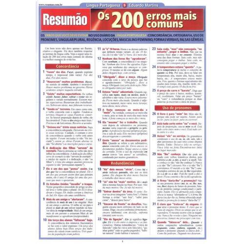 O Resumão Os 200 Erros Mais Comuns É Um Guia Prático Que Enumera Os Erros Que Você Deve Evitar No Uso Diário Da Língua Portuguesa Erros De Concordância Redundâncias Uso De Pronomes Singular E Plural Os Erros Mais Frequentes De Ortografia De Acentuação E Do Uso Do Hífen Erros De Regência O Uso Incorreto De Locuções E As Falsas Gêmeas As Formas Verbais Masculino E Feminino Palavras Malusadas E O Uso Da Crase Destaque Para Uma Lista De 14 Erros Que Você Deve Evitar A Todo Custo Atualizado De Acordo Com As Novas Regras De Ortografia