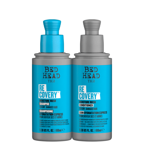 Kit com shampoo e condicionador em miniatura, para cabelos secos e danificados. Kit TIGI Bed Head Recovery Mini Duo devolve hidratação aos fios.