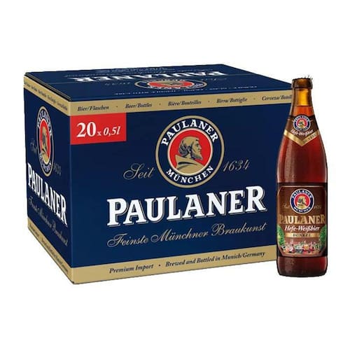 20x Cerveja Alemã PAULANER Weissbier Dunkel 500ml Cerveja Paulaner Hefe Weissbier Dunkel 500 ml. Cerveja alemã feita de 60% de malte de trigo e 40% malte de cevada, de coloração castanho-escuro, sua cor é proveniente somente da torrefação dos grãos de malte. Possui aroma de frutas passas. Na boca destacam-se as notas frutadas e de toffee com amargor equilibrado e persistente. Estilo: German Dunkelweizen Tipo de fermentação: ALE (alta fermentação) Graduação alcoólica 5,3%. Conteúdo 500ml. Cerveja importada da Alemanha. Caixa com 20 unidades de 500g