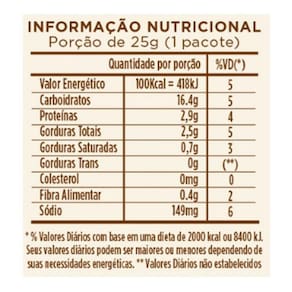 Farinha de soja integral, proteína texturizada de soja, óleo de palma, amido de mandioca, maltodextrina, sal, açúcar, extrato de levedura, realçador de sabor glutamato monossódico, corante caramelo IV, aromatizantes e acidulante ácido cítrico.