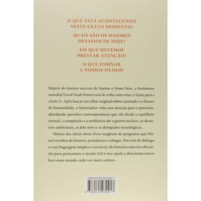 "O novo livro do autor de Sapiens e Homo Deus explora as grandes questões do presente e o que podemos fazer para melhoráloo podemos nos proteger de guerras nucleares, cataclismos ambientais e crises tecnológicas? O que fazer sobre a epidemia de fake news ou a ameaça do terrorismo? O que devemos ensinar aos nossos filhos?Em Sapiens, Yuval Noah Harari mostrou de onde viemos; em Homo Deus, para onde vamos. 21 lições para o século 21 explora o presente e nos conduz por uma fascinante jornada pelos assuntos prementes da atualidade. Seu novo livro trata sobre o desafio de manter o foco coletivo e individual em face a mudanças frequentes e desconcertantes. Seríamos ainda capazes de entender o mundo que criamos?"