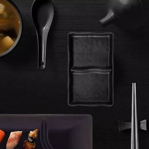 As 24 molheiras foram fabricadas em melanina, um material durável e resistência, a melanina é ideal para ambientes comerciais devido à sua capacidade de suportar o uso frequente sem perder a forma ou a cor. Cada molheira foi dimensionada para acomodar porções individuais de molhos, sua divisória interna permite separar o shoyu ou outros molhos em duas porções de 30ml cada. Isso facilita o serviço de diferentes tipos de molho simultaneamente, como shoyu e molho teriyaki, mantendo-os organizados e evitando misturas indesejadas. Além de shoyu, as molheiras são adequadas para servir uma variedade de molhos e condimentos, como molho de soja light, molho agridoce, ketchup, mostarda, maionese, molho barbecue, ou até mesmo azeite de oliva para saladas, oferecendo flexibilidade no serviço de mesa. As molheiras também possuem um design retangular, que além de economizar espaço na mesa, também facilita o agrupamento e organização durante o serviço, otimizando a eficiência dos garçons e proporcionando uma experiência agradável aos clientes.
