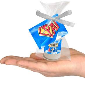 25 frascos de vidro com hidratante Kaiak 30ml cada 25 etiquetas com tema Dia dos Pais 25 tags com furo 25 fitas de cetim azul ou branca, conforme disponibilidade 25 saquinhos de celofane para um acabamento elegante