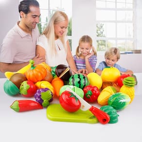 AVISO: Este produto pode conter pequenas peças, que são um risco de asfixia. Sugestão de supervisão de adultos. Um conjunto de brinquedos coloridos de frutas e vegetais para seus filhos. Feito de plástico ecológico, sem danos para as crianças, não tóxico. . Desenvolva a mente e a capacidade de pensamento da criança e treine sua coordenação olho-mão e flexibilidade da mão por sua própria operação. As crianças aprendem sobre diferentes tipos de frutas e sua aparência individual. As crianças podem encenar a preparação de frutas que as ajudarão a lembrar os nomes das frutas e desenvolver habilidades de contagem.