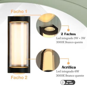 - Led: Led dos fachos: Branco quente 3W + 3W 3000K Led do acrílico: Branco quente 6W 3000K