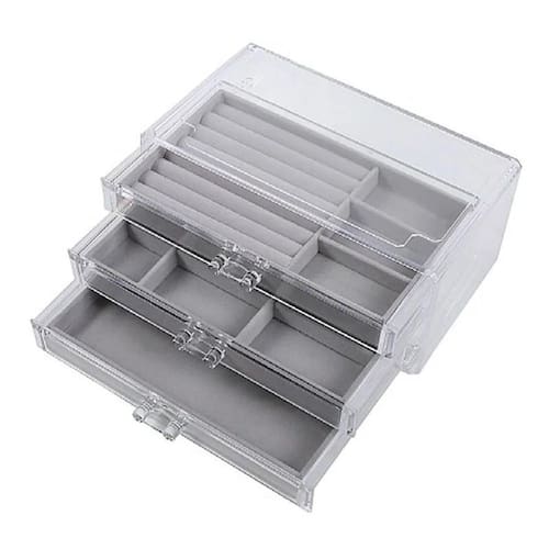 3 Bandejas Porta Joias Veludo Organizadora Bijuterias luxo CORES - CINZA / BEGE Envio de cores conforme disponivel. Caso queira uma cor específica, por favor informar no campo de mensagem a cor desejada após o pagamento. Apresentamos o Porta Jóias Portátil Divisória Organizador Feminino Multius da marca sweet Home. Este elegante organizador de jóias é feito de acrílico de alta qualidade no exterior e veludo de alta qualidade no interior, proporcionando um toque de sofisticação e durabilidade. Com 11 compartimentos e 3 gavetas, oferece espaço suficiente para guardar todos os seus preciosos acessórios de forma organizada e segura. O design é moderno e neutro, combinando facilmente com qualquer decoração. Apesar de não possuir fechadura e espelho, este porta jóias é perfeito para manter suas jóias organizadas, seja em casa ou em viagens. O modelo Porta Joia Acrílico da Sweet Home é ideal para Anéis, Relógios, pulseiras, brincos... A Maleta é prático e funcional, tornando-o um item indispensável para todas as mulheres que valorizam suas jóias e acessórios. Ean: 0789652145511