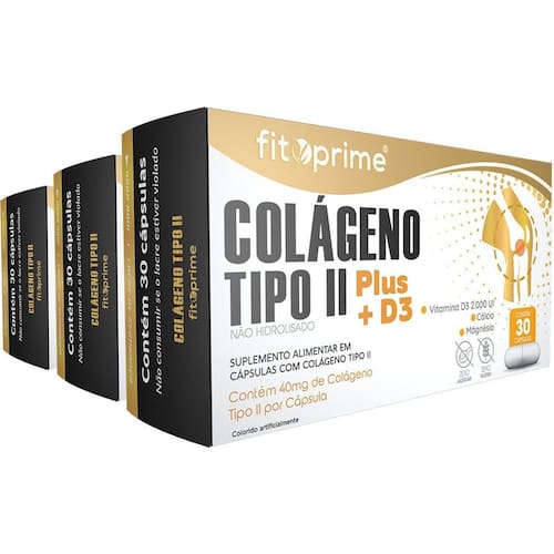 3 Caixas de Colágeno Tipo 2 Plus + Vitamina D3 40mg com 30 cápsulas Fitoprime